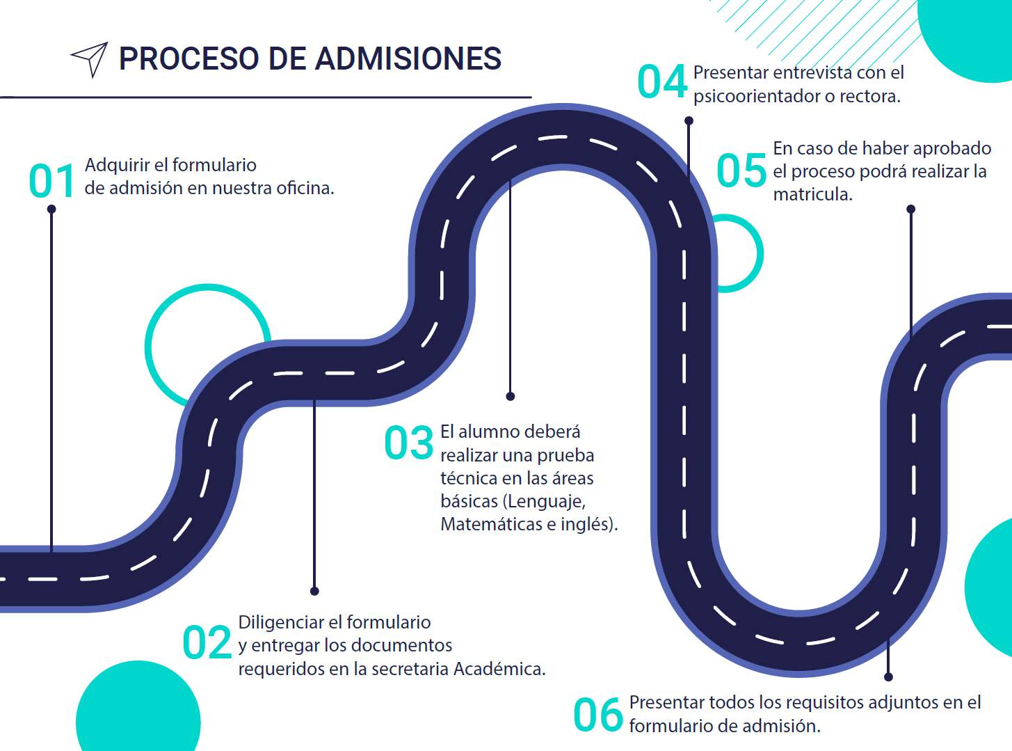 3. Agenda una cita en nuestra oficina física o por nuestra línea de WhatsApp para solicitar la hora y la fecha del examen de admisión y la entrevista. 4. El día de la prueba deberá estar presente un acudiente quien recibirá los resultados del proceso aplicado, para darle continuidad al proceso de matrícula.